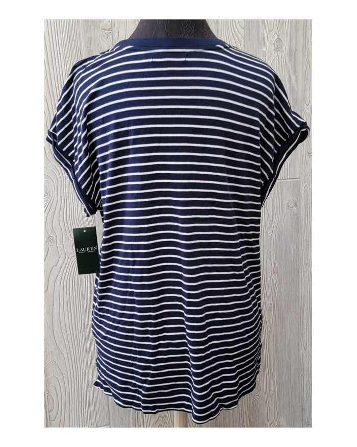New Lauren Ralph Lauren LG Navy & White Stripe Logo Cotton T-Shirt