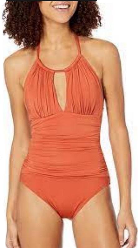 NWOT Kenneth Cole M Core Power High Neck Shirred 1pc Swimsuit Orange 95064