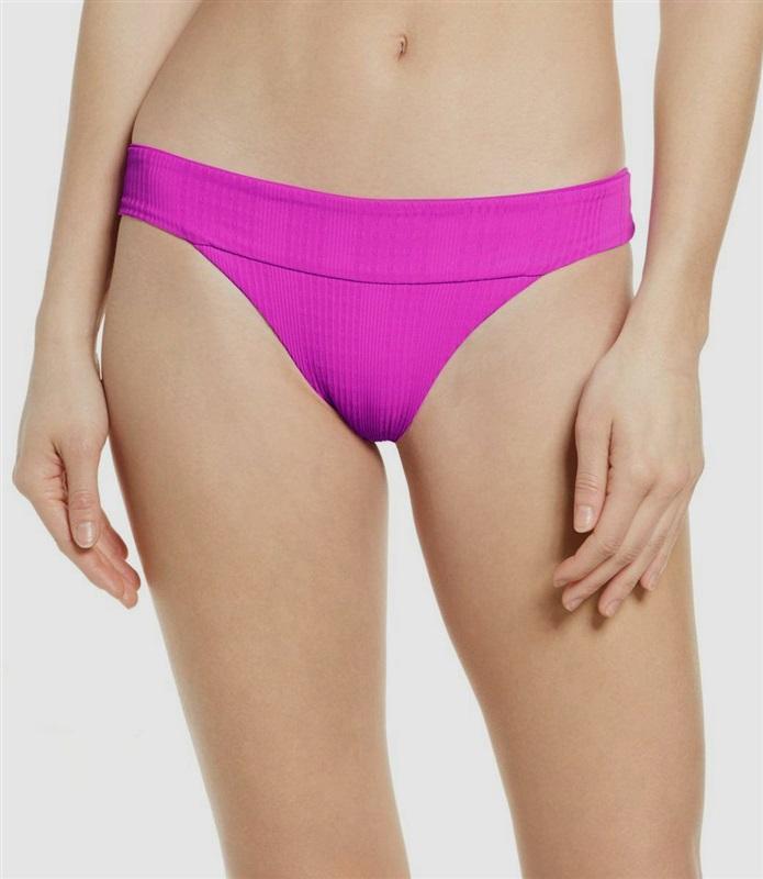 A wide waistband creates a stylish fold-over look and smooth fit on classic bikini bottoms in a ribbed fabric.