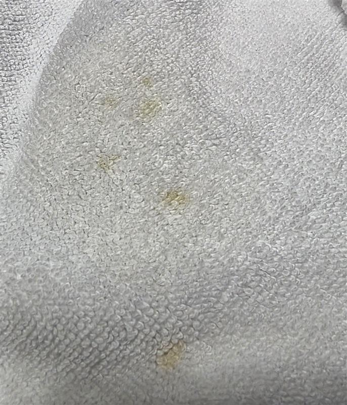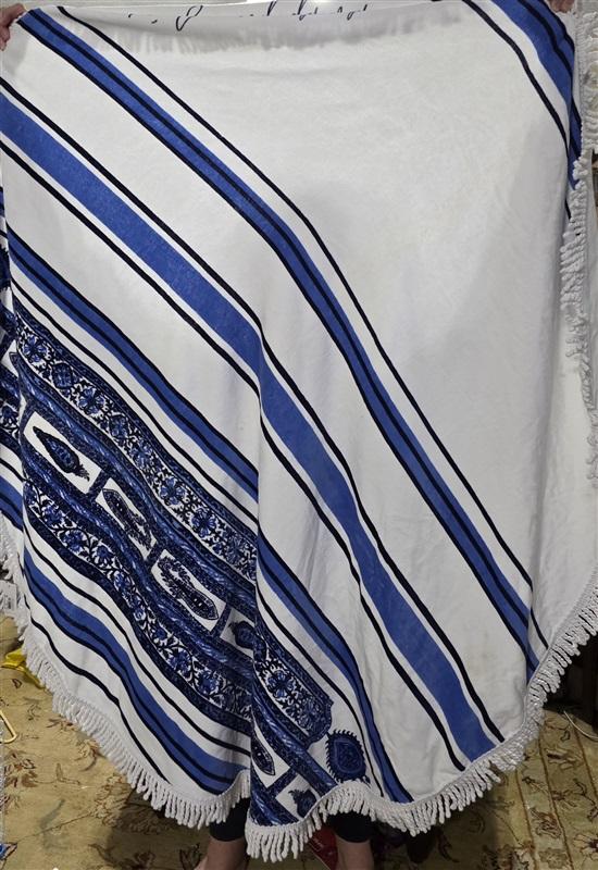 The towel features a white background with blue and black vertical stripes and white fringe.