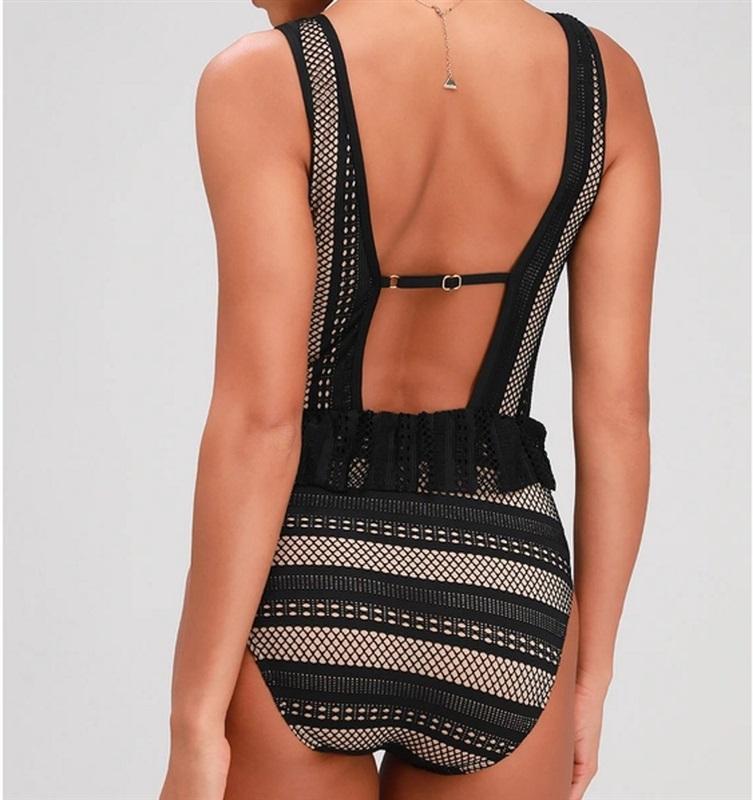 Look summer-ready on the beach in the Ella Moss Heart a Flutter Black Lace One-Piece Swimsuit! This adorable one-piece is made from black stretch knit lace over a nude liner and features a plunging neckline with a connecting strap across the bust and padded bodice.