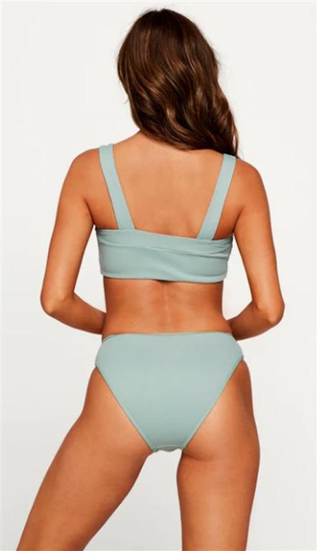 Ribbed solid Reef Green bikini bottom with waist edge strap crosses on front.