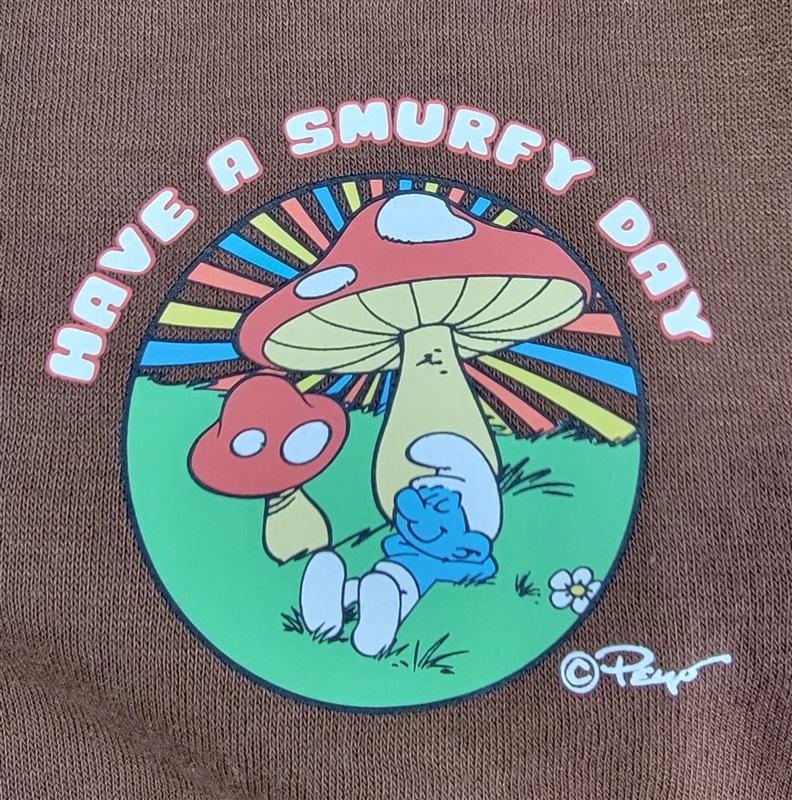 Smurf emblem on Chest and then at the bottom a wrap around design with Smurfette on the back.