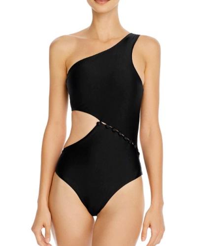 A unique one-shoulder swimsuit featuring modest front buttons and a strategic side cutout offers an innovative, sleek beach look.