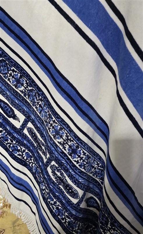 The towel features a white background with blue and black vertical stripes and white fringe.